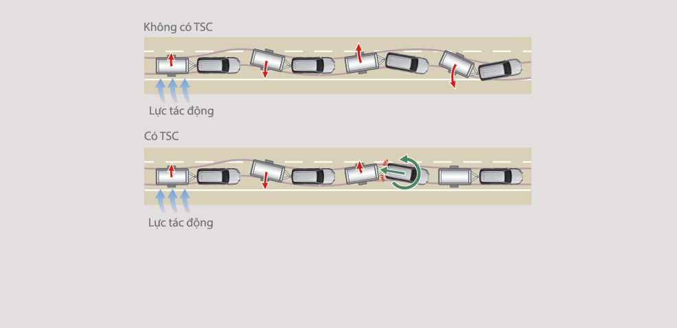 Hệ thống VSC kiểm soát công suất động cơ và phân bổ lực phanh hợp lý tới từng bánh xe, nhờ đó giảm thiểu nguy cơ mất lái và trượt bánh xe đặc biệt trên các cung đường trơn trượt hay khi vào cua gấp.