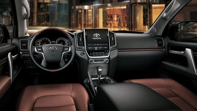 Về nội thất của Land Cruiser được sử dụng thiết kế hầu hết bằng những vật liệu chất lượng cao. Ghế bọc da màu nâu sang trọng. Hàng ghế trước có sưởi và thông gió, chỉnh điện 12 hướng, tích hợp nhớ 3 vị trí ghế ngồi.
