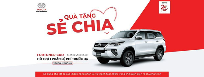 Cụ thể, khách hàng mua xe Fortuner 2.4 AT 4x2 (FK) và Fortuner 2.4 MT 4x2 (FG) hoàn tất thủ tục thanh toán 100% từ ngày 01/05 đến hết ngày 31/05/2020 tại các đại lý Toyota sẽ được hỗ trợ một phần lệ phí trước bạ, quy đổi ra tiền mặt tương đương hàng chục triệu đồng.