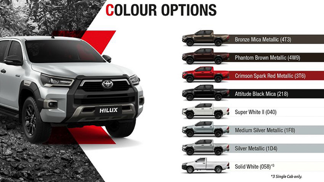 Thị trường Malaysia sẽ có 5 phiên bản Hilux, đa dạng từ Single Cab đến Double Cap. Trong đó phiên bản Hilux Single Cab duy nhất 2.4 MT 4×4 có giá từ 93.880 RM tương đương 515 triệu đồng / Toyota Hilux 2.4E AT 4×4 có giá từ 109.880 RM tương đương 604 triệu đồng / Toyota Hilux 2.4G MT 4×4 có giá từ 112.880 RM tương đương 620 triệu đồng / Toyota Hilux 2.4V AT 4×4 có giá từ 134.880 RM tương đương 741 triệu đồng / Toyota Hilux 2.8 Rogue AT 4×4 có giá từ 148.880 RM tương đương 818 triệu đồng.