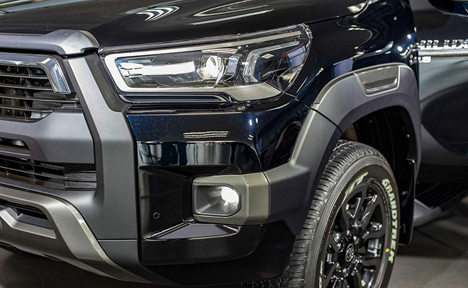 Hệ đèn pha cũng xe cũng thay đổi đồ họa so với mẫu Hilux cũ kết hợp kiểu LED chạy ban ngày mới. Trong khi đó, cản trước được điều chỉnh, xuất hiện các khe hút gió mới ở cạnh đèn sương mù dạng boomerang. Đèn hậu xe cũng mỏng và hiện đại hơn.