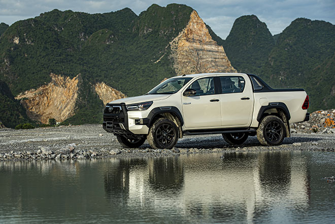 Ở phiên bản mới, Hilux sở hữu phần đầu xe thay đổi ấn tượng với lưới tản nhiệt hình thang, kết hợp cùng cản trước được tái thiết kế mang đến vẻ ngoài mạnh mẽ, hầm hố. Cụm đèn sương mù phía trước và cụm đèn hậu phía sau cũng được tinh chỉnh, tạo hình hiện đại, vuông vức. Riêng ở phiên bản cao cấp nhất Adventure được trang bị hệ thống đèn pha với công nghệ bi-LED, cùng bộ vành 18-inch nổi bật, cuốn hút.