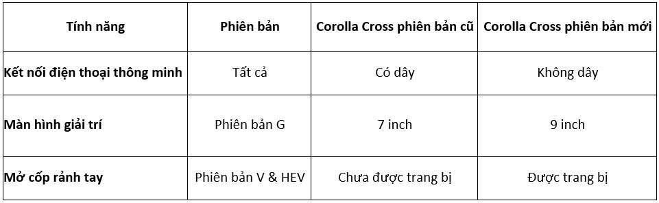 Kể từ khi ra mắt năm 2020, Toyota Corolla Cross đã được khách hàng Việt Nam tin tưởng và lựa chọn, với hơn 50,000 xe được giao tới khách hàng trong suốt hơn 2 năm qua. Kể từ tháng 01/2023, với những nâng cấp về trang bị và tính năng mới như: Kết nối không dây điện thoại thông minh trên tất cả phiên bản, tăng kích thước màn hình giải trí với phiên bản G, bổ sung tính năng Mở cốp rảnh tay với phiên bản V & HEV, Corolla Cross hứa hẹn sẽ đem đến cho khách hàng những trải nghiệm tuyệt vời và tiếp tục là mẫu SUV đô thị dẫn đầu xu thế với thiết kế sang trọng, hiện đại, là người bạn đồng hành đáng tin cậy trên hành trình chinh phục thành công mới.