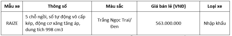 Tiếp nối thành công của mẫu xe Toyota Raize trong năm 2022 với hơn 6.200 xe được giao tới tay khách hàng trong năm 2022, Toyota đã bổ sung thêm màu ngoại thất Trắng ngọc trai/ Đen trên mẫu xe này nhằm tăng thêm lựa chọn cho khách hàng trẻ. Tùy chọn màu mới này sẽ chính thức có mặt tại hệ thống đại lý Toyota trên toàn quốc từ ngày 03/01/2023 với giá bán lẻ như sau: