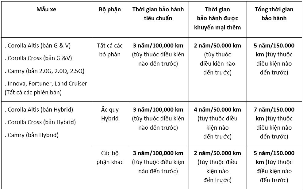 Ngoài ra, nhân dịp chào đón năm mới, Toyota Việt Nam tiếp tục triển khai chương trình ưu đãi tặng “Gói gia hạn bảo hành 2 năm hoặc 50.000 km (tùy điều kiện nào đến trước)” dành cho khách hàng mua một số dòng xe Toyota từ ngày 01/01/2023 đến hết ngày 31/12/2023. Chương trình được áp dụng với tất cả các phiên bản, thông tin cụ thể như sau: