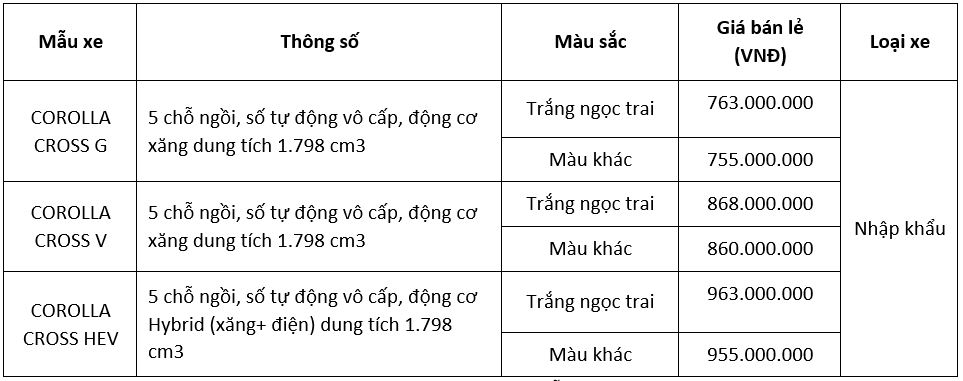 Các phiên bản nâng cấp của Toyota Corolla Cross sẽ chính thức có mặt tại hệ thống đại lý Toyota trên toàn quốc từ ngày 03/01/2023 với giá bán lẻ như sau: